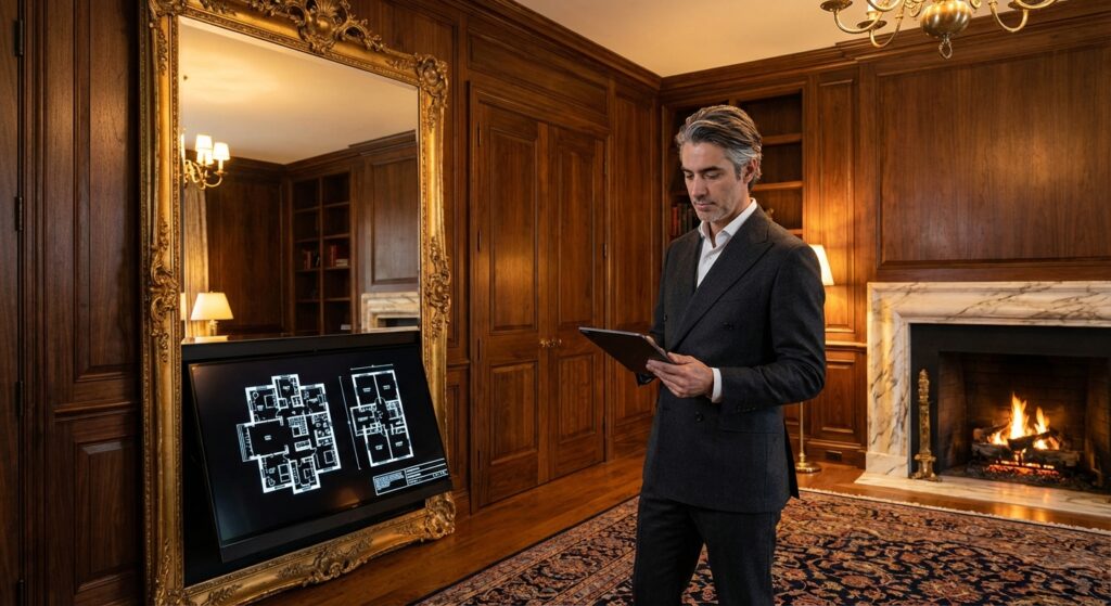 The term “hidden tech corridor” describes a spatial strategy in which all cabling, conduit, and equipment housings are confined to defined concealment planes that never intersect the decorative surface at an unplanned point. In classical rooms, the available concealment planes are three: the wall cavity between the structural substrate and the boiserie face (typical usable depth: 80 mm to 150 mm depending on construction type), the ceiling void above any suspended coffer or plasterwork plane (typical usable depth: 300 mm to 600 mm), and the raised floor plenum beneath engineered hardwood flooring (typical usable depth: 100 mm to 250 mm).